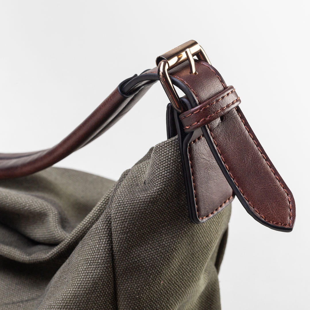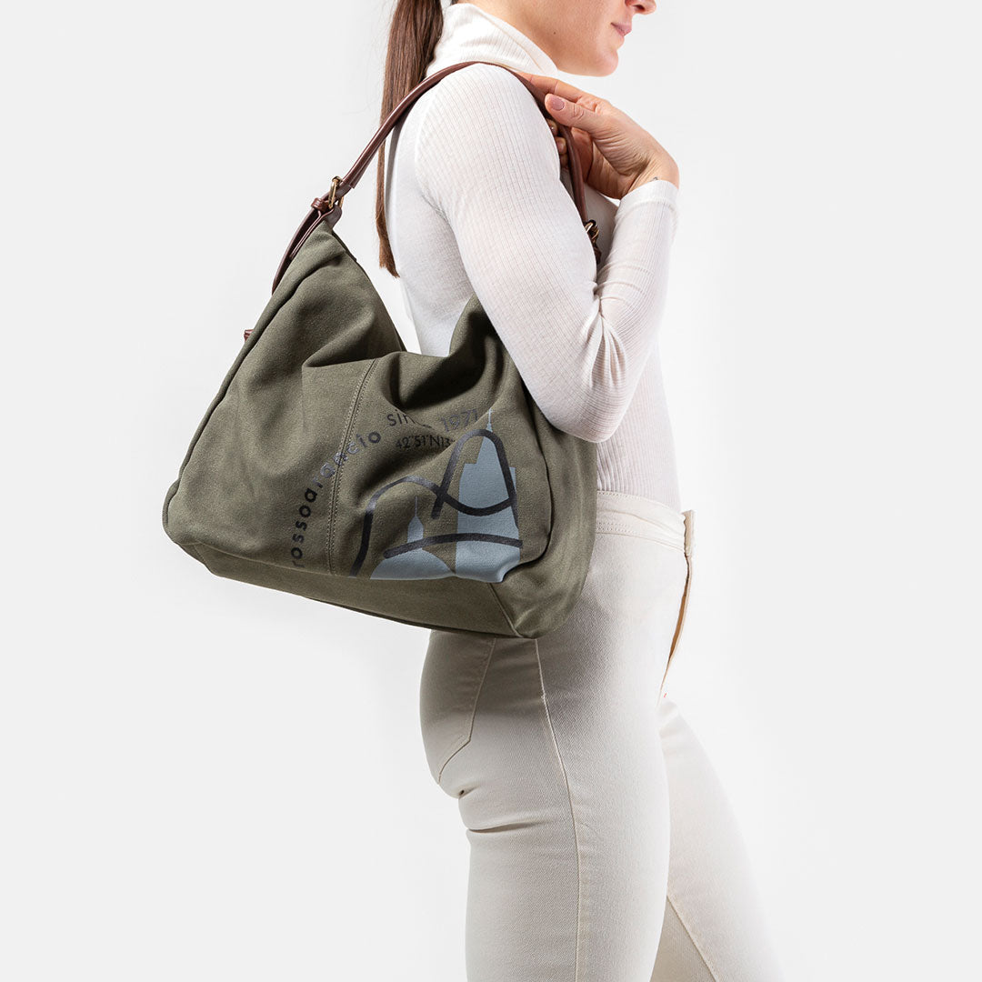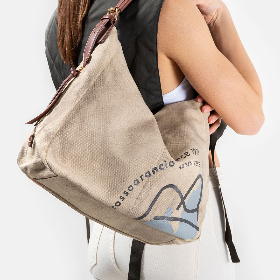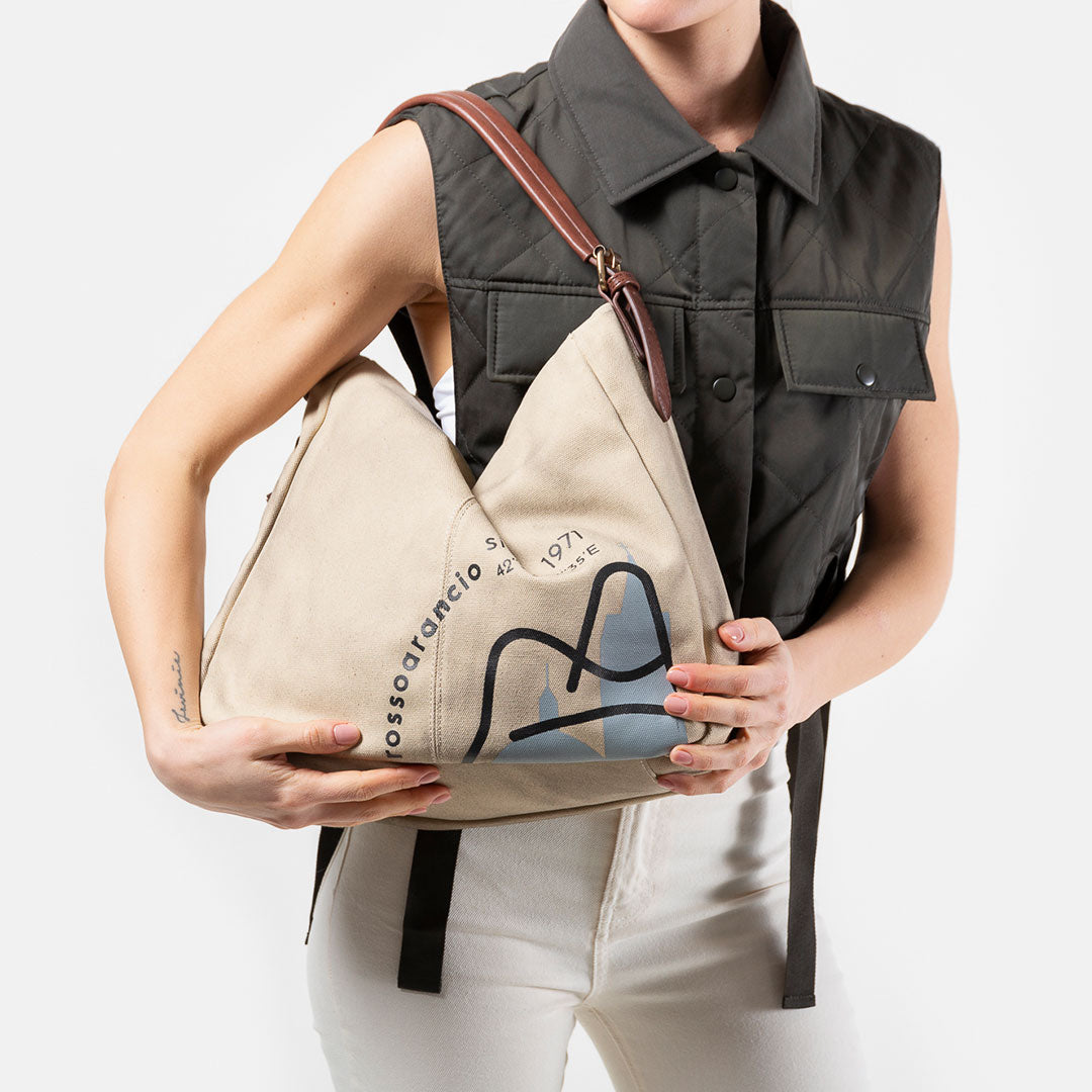 Hobo bag in stile vintage, richiama il mito della Dea della caccia Artemide proprio per il suo carattere fiero, tenace, indomabile. Realizzata in canvas “invecchiato” con rifiniture marrone bruciato. La stampa stilizzata richiama il logo Rossoarancio e le meravigliose chiese romaniche della città di Ascoli, di cui si tracciano le coordinate.